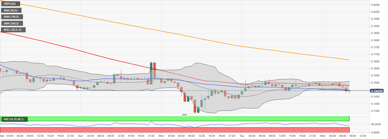 On the intraday charts, XRP/USD is hovering around the local pivotal level created by SMA50 1-hour at $0.1450. If the price moves sustainably lower, the next support created by psychological $0.1400 will come into focus. It is followed by $0.1350 ( the lower line of 4-hour Bollinger Band). Meanwhile, if this level is cleared, the sell-off will gain traction and bring $0.1100 back in focus.