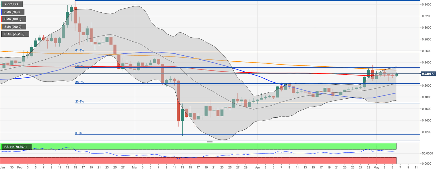 XRP/USD settled above the daily SMA100 at $0.2165, which is a positive signal for XXRP bulls. However, further recovery is limited by SMA200 at $0.2265. This area has served as a strong resistance since April 29. Once this barrier is out of the way, the upside momentum will gain traction with the next focus on psychological $0.23, followed by the upper line of the daily Bollinger Band and 50% Fibo retracement for the downside move from February 2020 high on approach to $0.2360.