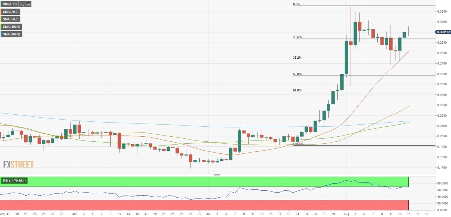 Following the impressive rally witnessed in the last week of July, Ripple (XRP/USD) staged a deep correction to the Fibonacci 38.2% retracement level and found support there. After posting strong gains and rising nearly 6% in the last two days, however, XRP/USD struggled to preserve its bullish momentum in choppy weekend trading and was last seen flat on the day near $0.30.