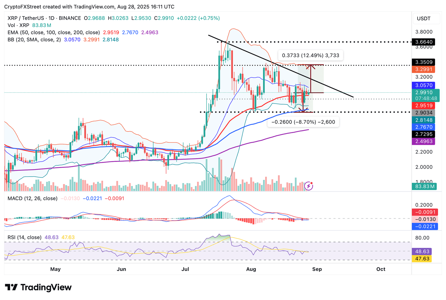 As for the anticipated breakout, traders will look for the blue MACD line to cross above the red signal line, reinforcing the bullish grip. Key areas of interest for traders are the next resistance at $3.35, which was tested on August 15 and the 100-period EMA at $2.76 in the event market dynamics shift and XRP accelerates the decline below the 50-period EMA at $2.95.