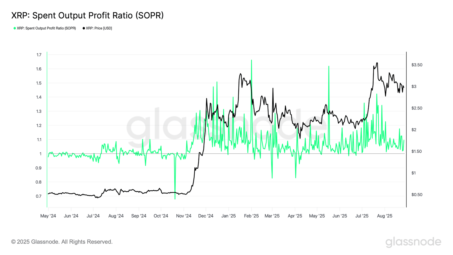 - The Spent Output Profit Ratio remains above 1, indicating XRP supply is still in profit, but investors are reluctant to sell.