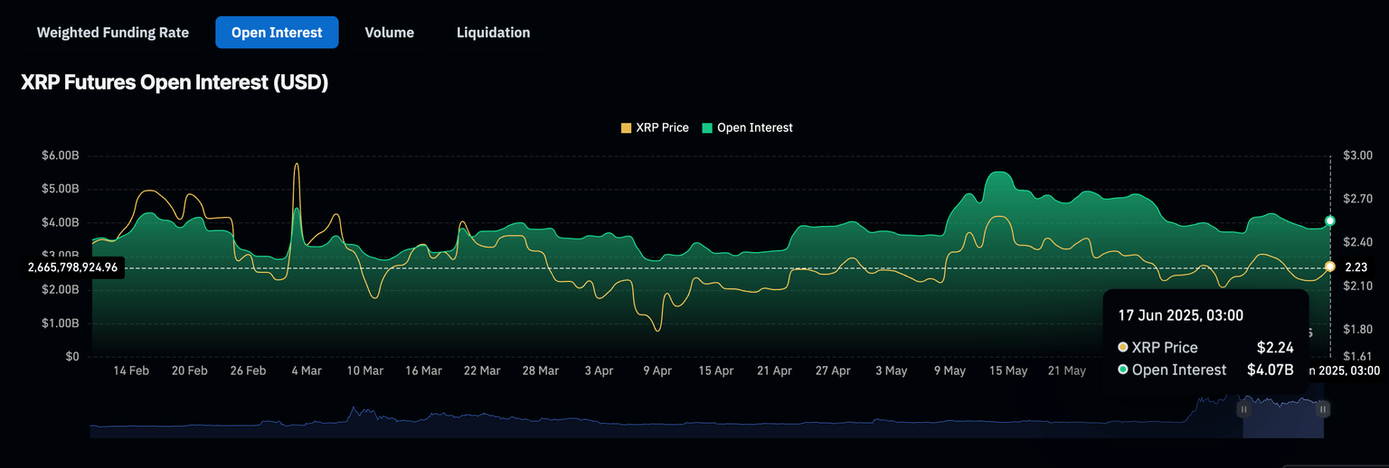 - XRP futures Open Interest rises slightly to $4 billion but remains in an overall downtrend from the mid-May peak of $5.52 billion.