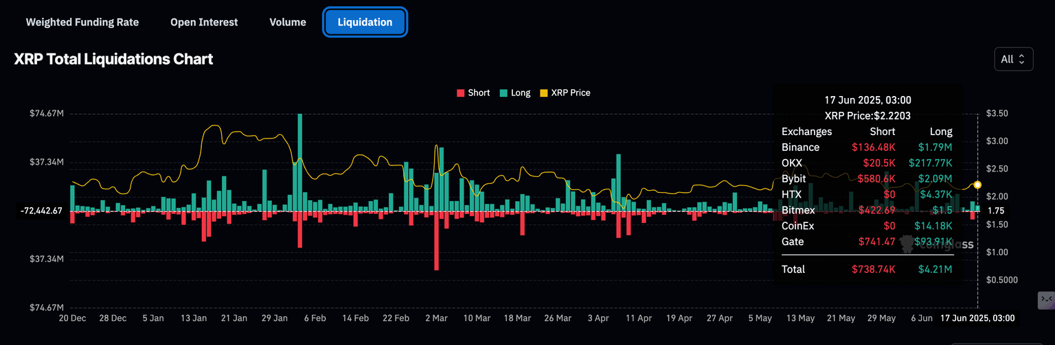 Key fundamental indicators, such as the futures market Open Interest (OI), support the lack of conviction and interest in XRP. CoinGlass highlights a minor uptick in the OI to $4 billion, as illustrated in the chart below. However, the overall trend has remained downward since the surge to $5.52 billion around mid-May.