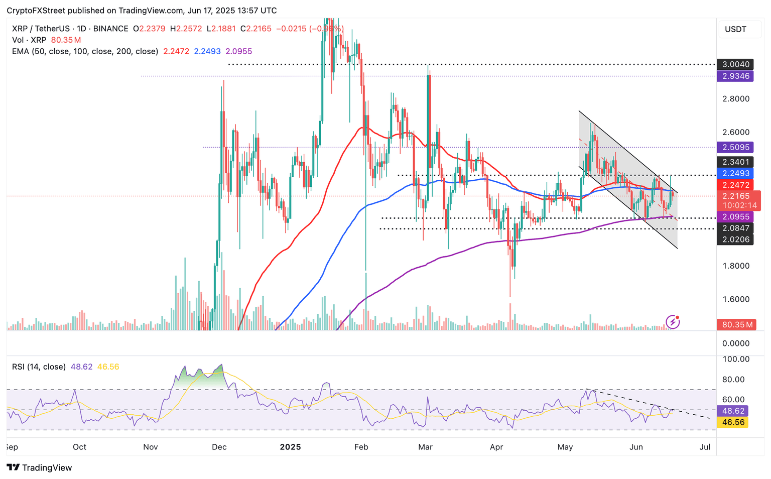 XRP’s price generally slides within a descending channel, extending the decline from May’s peak of $2.65. An attempt to break free of the upper trendline resistance on Monday failed, highlighting the supply-rich confluence resistance at around $2.24. The 50-day Exponential Moving Average (EMA) and the 100-day EMA converge at this level, marking a robust hurdle.