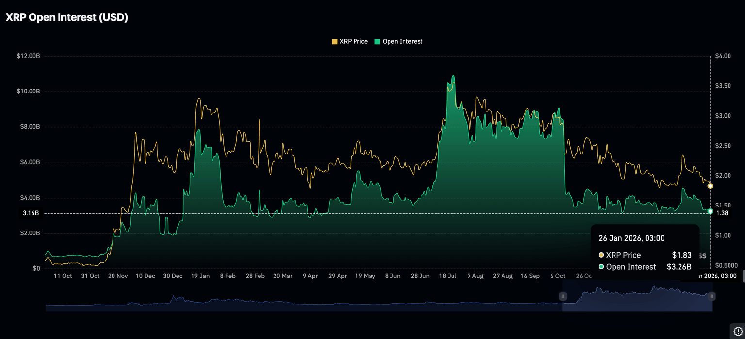 XRP continues to face a weak derivatives market as risk-off sentiment spreads across the crypto space. CoinGlass data shows that Open Interest (OI) averages $3.26 billion on Monday, down from $3.4 billion the previous day, and $4.55 billion on January 6.