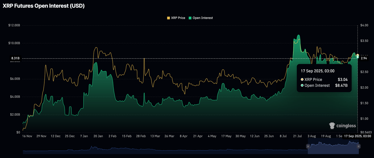Meanwhile, retail demand for XRP remains relatively high, with the futures Open Interest (OI) averaging at $8.47 billion on Wednesday, up from $7.37 billion on September 7.