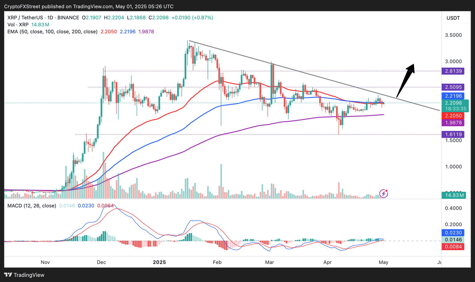 XRP currently hovers at $2.21, with the confluence support established by the 50- and 100-day EMAs. The Moving Average Convergence Divergence (MACD) indicator confirms the uptrend after crossing above the mean line, accompanied by green histograms. The buy signal highlighted by this indicator was triggered when the MACD line (blue) crossed above the signal line (red) on April 11.