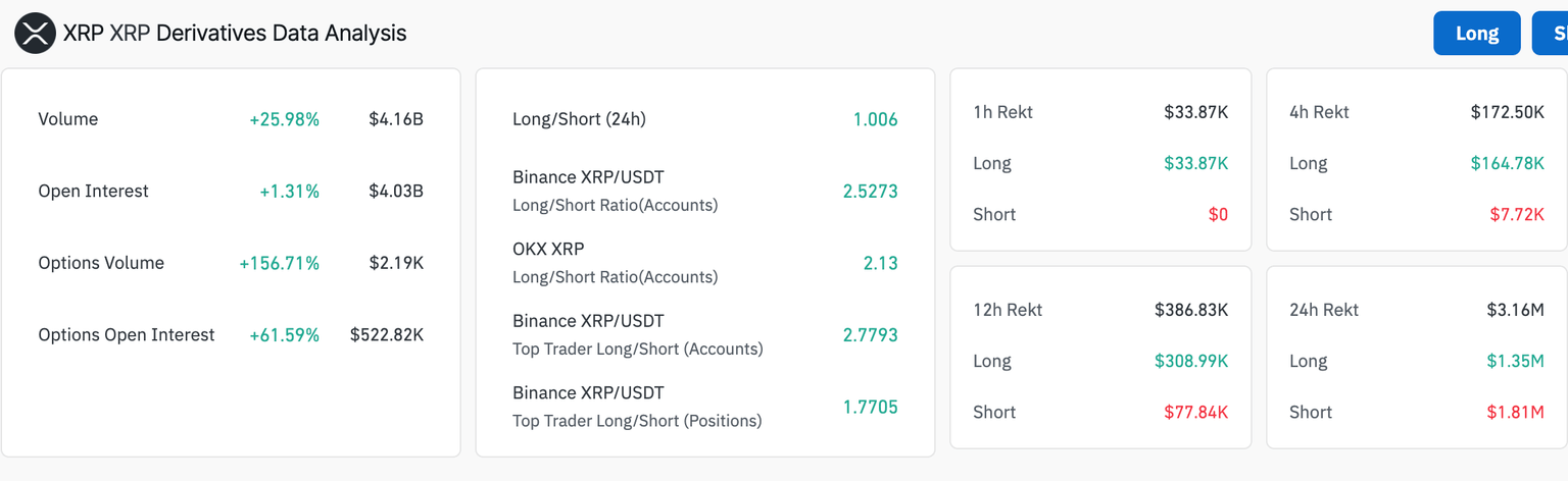 The XRP derivatives market data indicates bullish potential, with Open Interest (OI) rising by 1.31% to $4.00 billion.