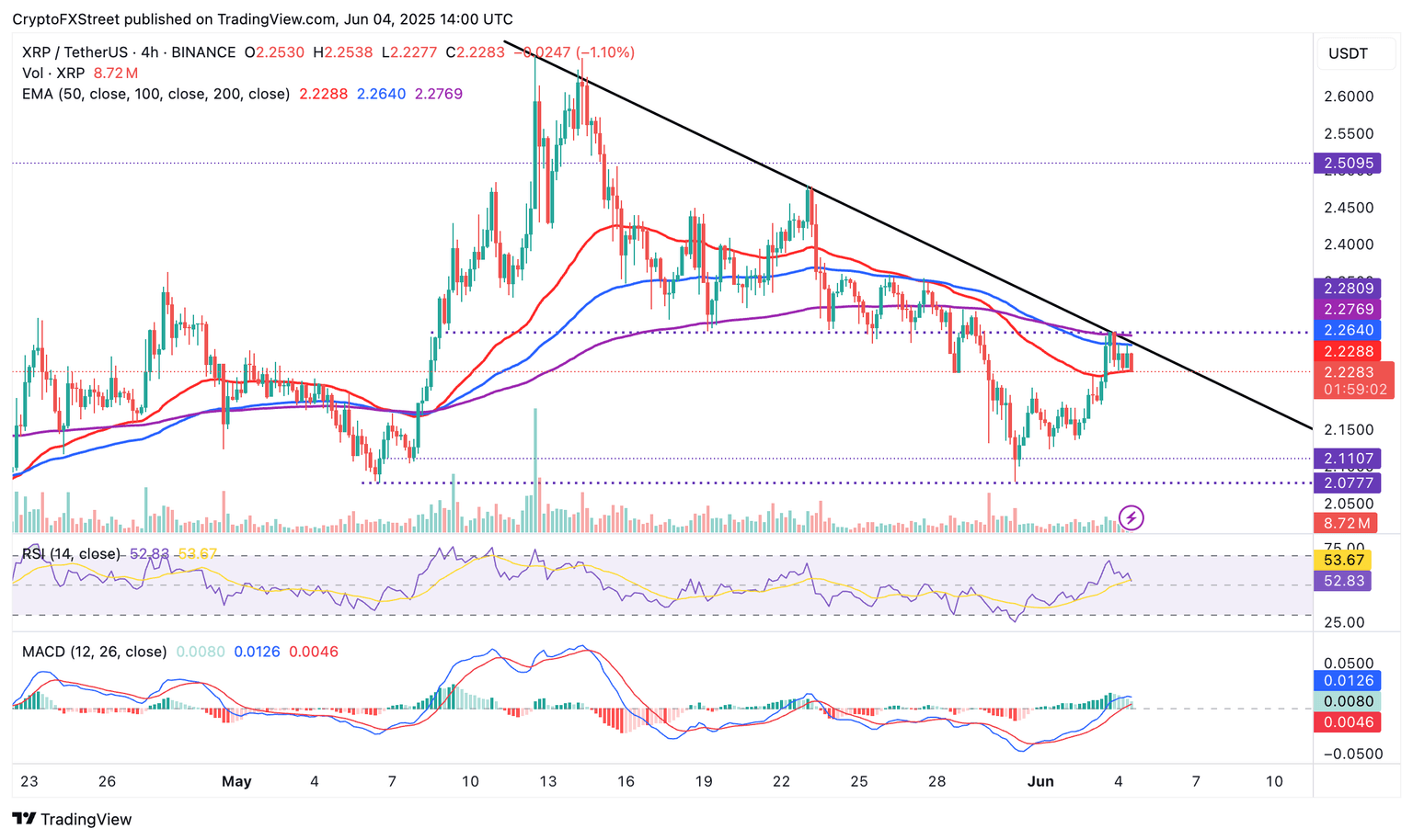 XRP’s price hovers sideways between the support offered by the 4-hour 50-period Exponential Moving Average (EMA) at around $2.22 and the resistance highlighted by the 100-period EMA at $2.26.