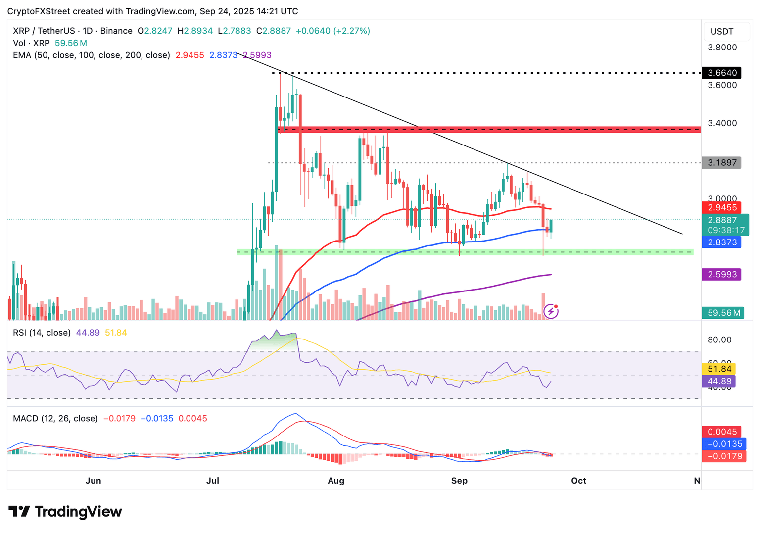 Key areas of interest for traders include the 50-day EMA, which marks a near-term resistance level at $2.94, and a descending trendline that has remained in place since XRP hit a new record high of $3.66 on July 18. Trading above this trendline could enhance XRP's recovery potential toward the next key hurdle, highlighted in red on the daily chart, at approximately $3.38.