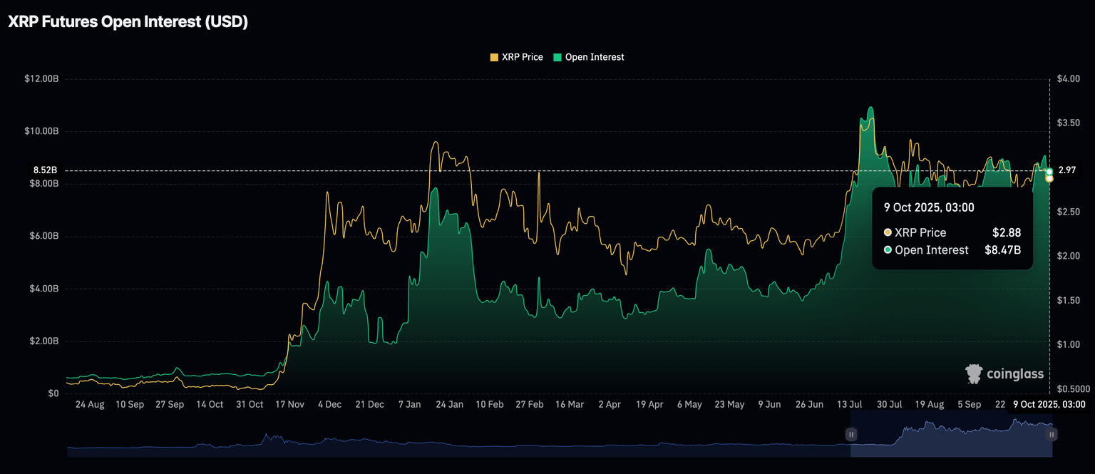 OI is the notional value of outstanding futures contracts. Hence, a correction implies that traders could be losing confidence and conviction in XRP’s ability to sustain recovery above the pivotal $3.00 level. A steady decline in the OI often signals the potential for an extended price correction.