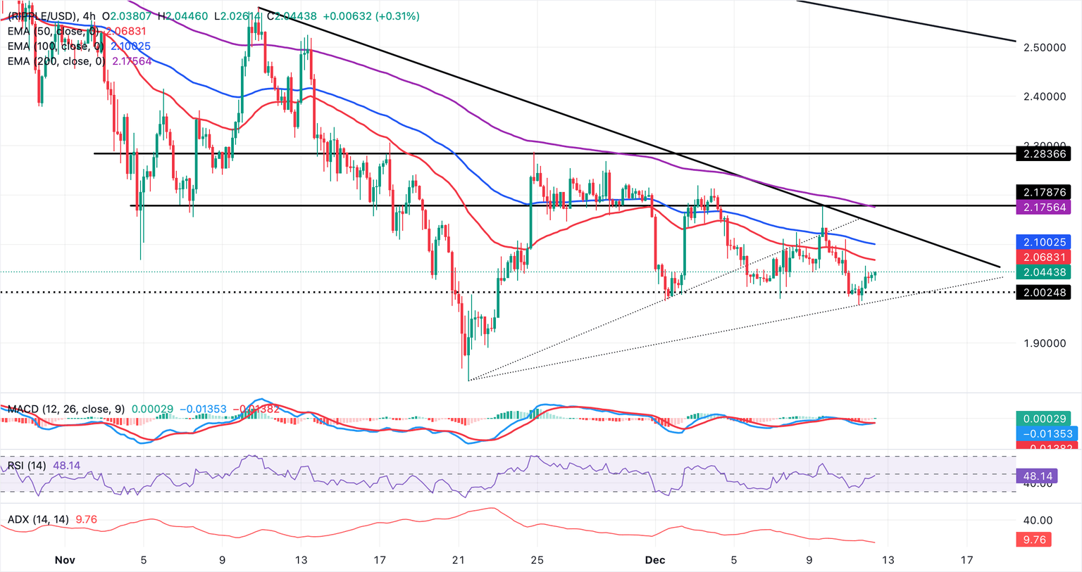 A descending trend line from $2.58 limits gains, with resistance seen at $2.13. However, a sustained push through this barrier could encourage a broader rebound.