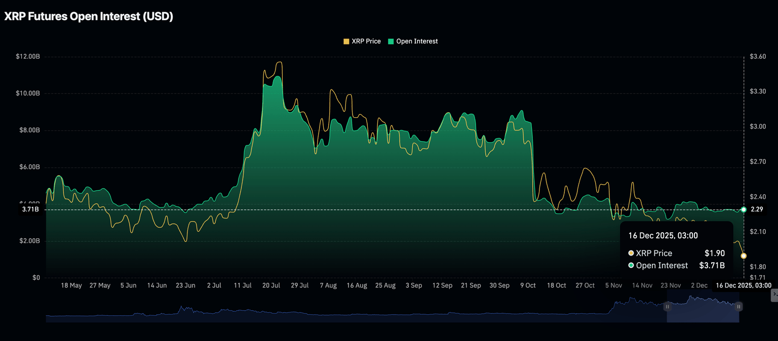 - XRP retail demand remains significantly suppressed, with futures Open Interest averaging $3.71 billion.