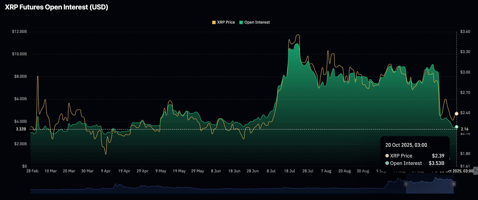 - The XRP futures Open Interest dips to $3.53 billion after a cascade of volatile deleveraging events.