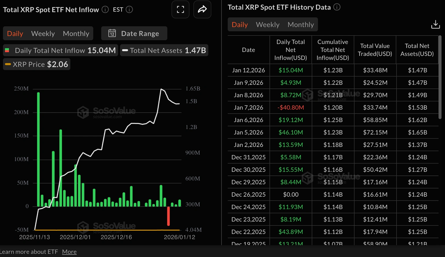 Ripple (XRP) is trading sideways above support at $2.00 at the time of writing on Tuesday. Recovery has remained elusive despite steady inflows into spot Exchange Traded Funds (ETFs), which have cumulatively attracted $1.23 billion.