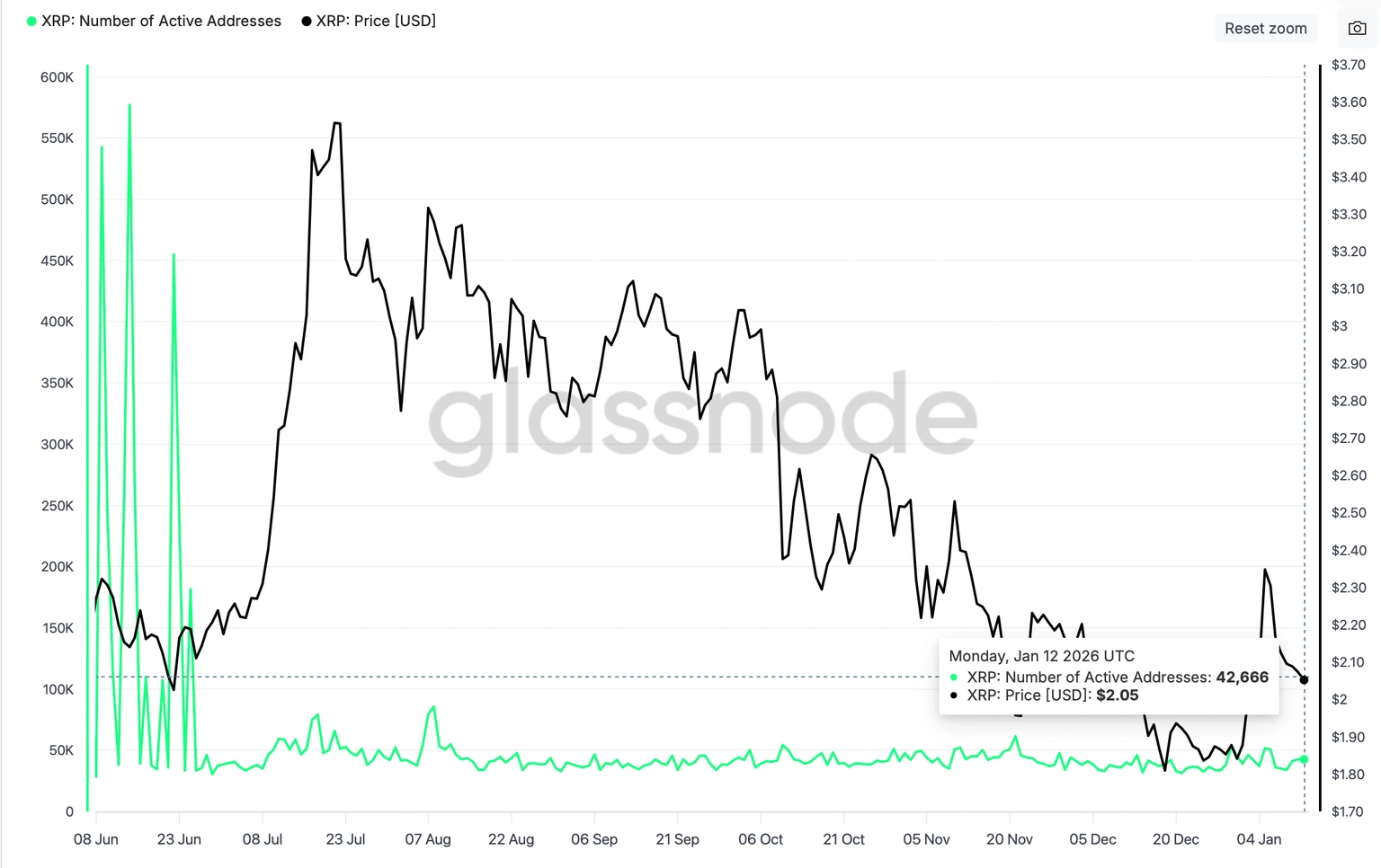 The number of addresses actively transacting on the XRP Ledger (XRPL) has declined by 17.5% to approximately 42,600 as of Monday from 51,500 recorded on January 5, according to Glassnode’s data.
