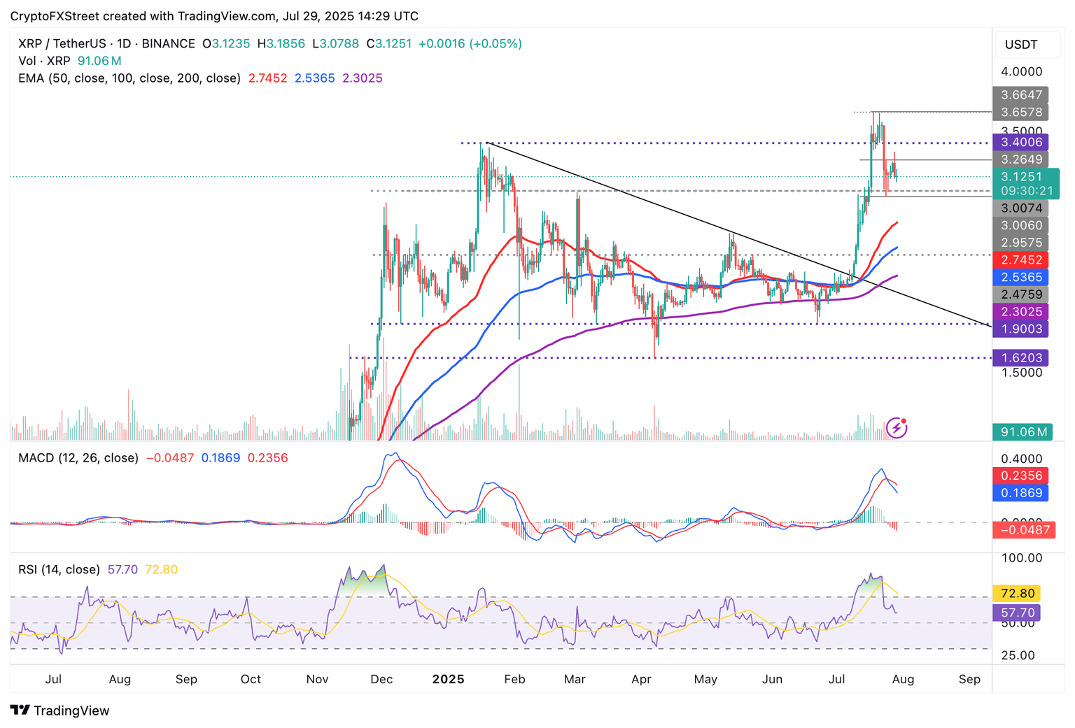 Ripple (XRP) price is choppy, trading broadly sideways on Tuesday with support at $3.00 and short-term resistance at $3.20. Several attempts to erase the 16% decline from the money remittance token's record high of $3.66 have been subdued amid increasing selling pressure and fading bullish momentum.