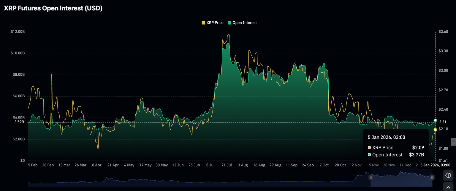 XRP is rising for the fifth consecutive day, supported by steady inflows into spot Exchange Traded Funds (ETFs). Retail interest in the cross-border remittance token shows signs of a gradual comeback, as evidenced by futures Open Interest (OI) rising to $3.8 billion.