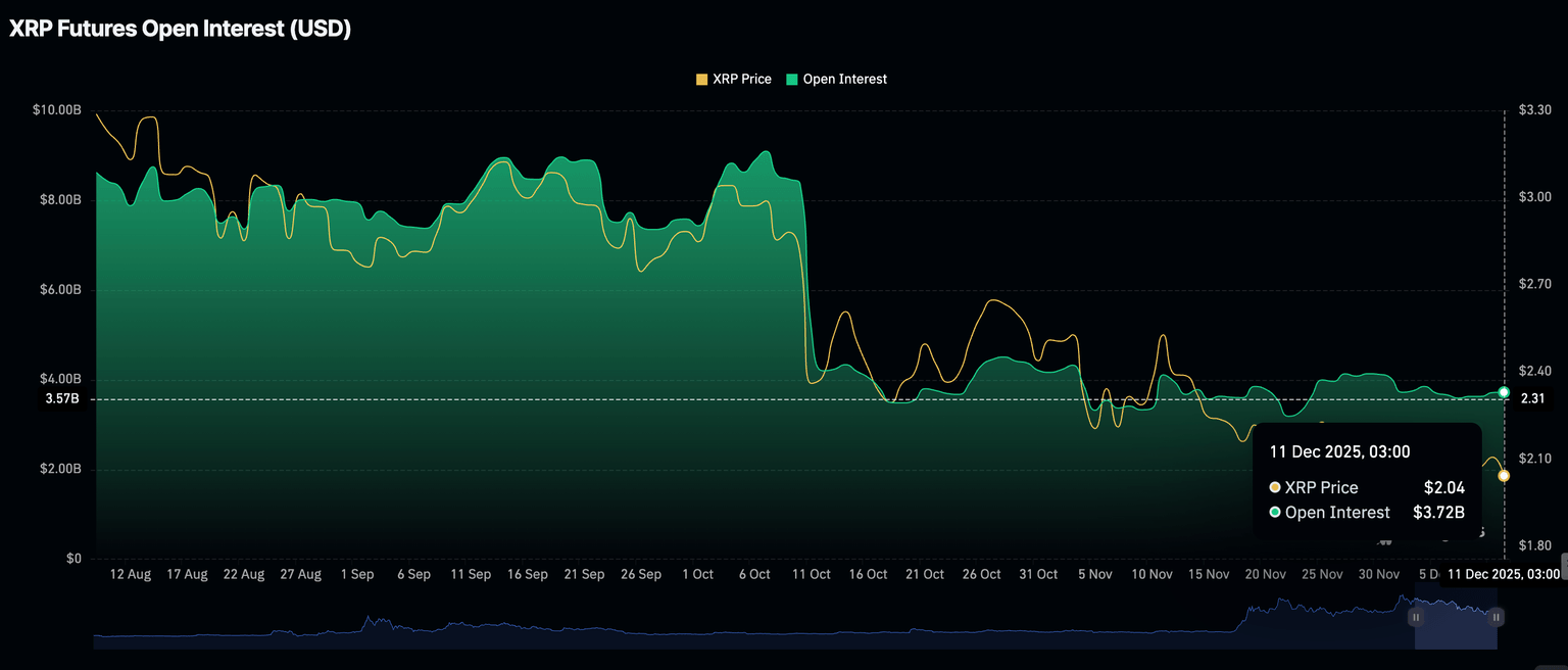 - XRP faces subdued retail demand, with Open Interest averaging $3.72 billion, compared to the $10.94 billion record high.