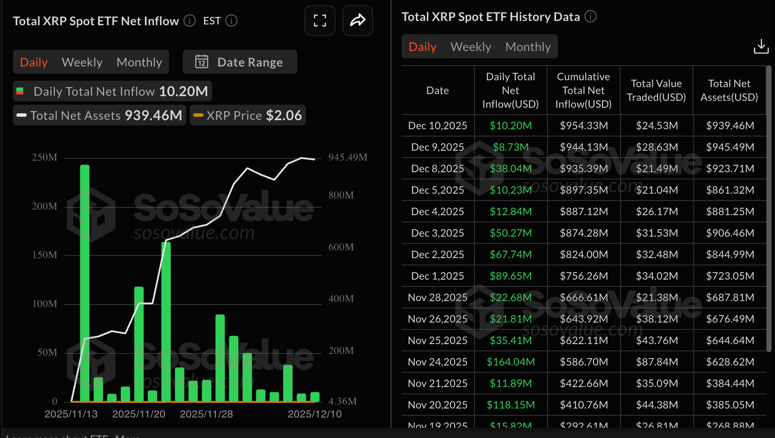Since their launch on November 13, XRP ETFs have not experienced outflows, with cumulative inflows totaling $954 million and net assets amounting to $940 million.