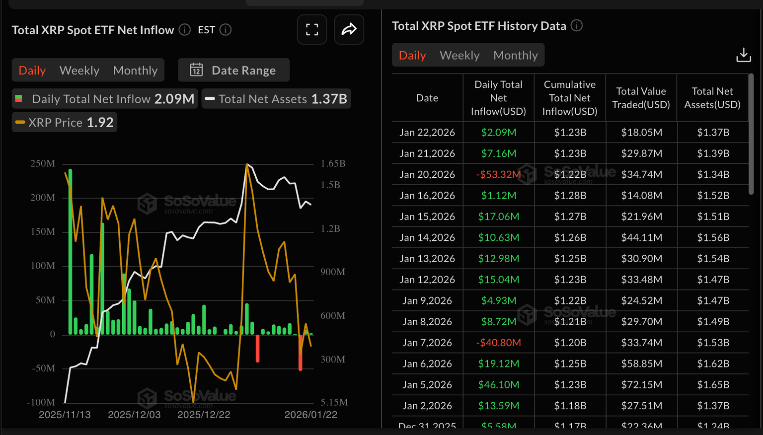 XRP spot ETFs recorded mild inflows of approximately $2 million on Thursday despite risk appetite deteriorating across crypto assets this week. The cumulative total inflow stands at $1.23 billion, and the net assets at $1.37 million, according to SoSoValue data. Demand for US-listed XRP ETFs has remained relatively stable, with only two days of outflows.