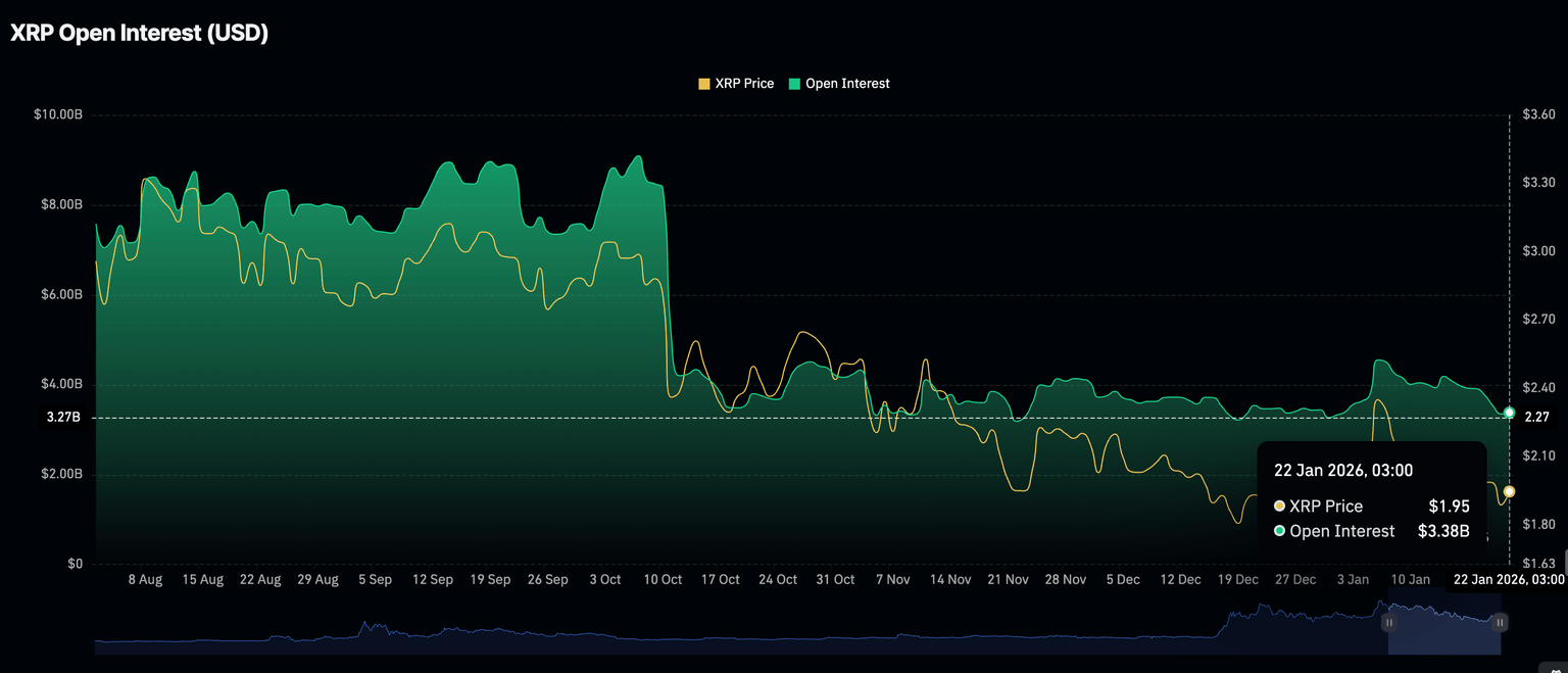 Retail interest in XRP remains largely subdued despite institutional investors leaning back into risk. CoinGlass shows futures Open Interest (OI) averaging $3.38 billion on Thursday, up slightly from $3.35 the previous day. The OI has declined from $4.55 billion recorded on January 6, underlining the prevailing risk-off sentiment. Low retail interest may constrain XRP’s upside.