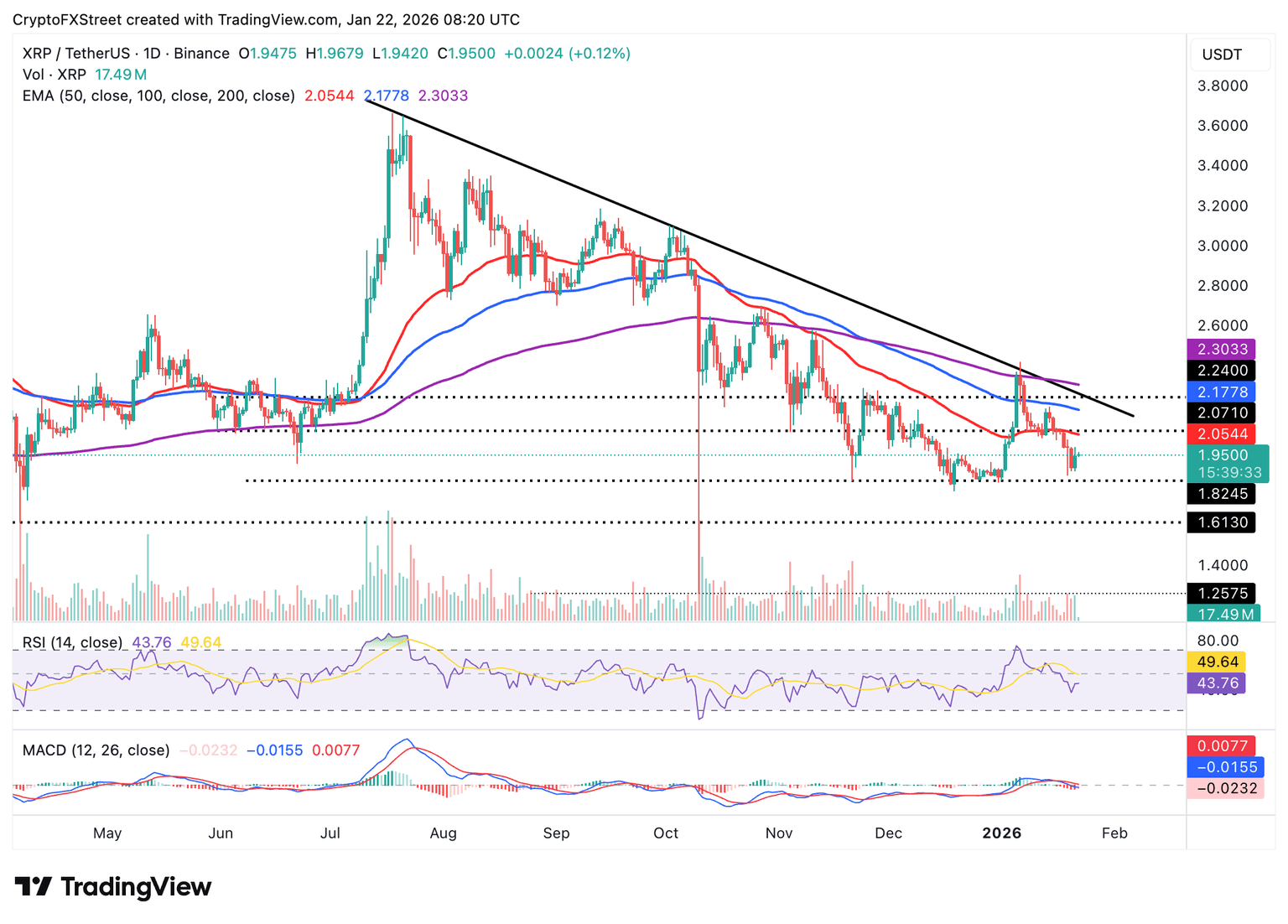 - XRP stabilizes above $1.90 short-term support, but remains below the 50-day EMA resistance.
