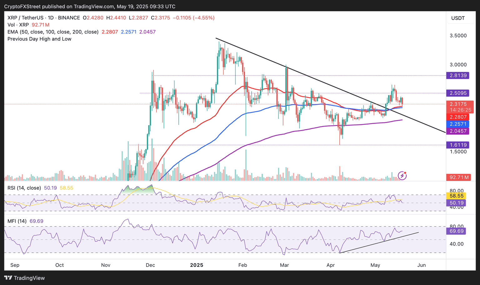 Ripple (XRP) price hovers at around $2.31 on Monday, extending its gradual drawdown from last week’s high of $2.65, as the broader cryptocurrency market swings between gains and losses amid shifting investor sentiment. Protecting XRP's immediate downside is the 50-day Exponential Moving Average (EMA).