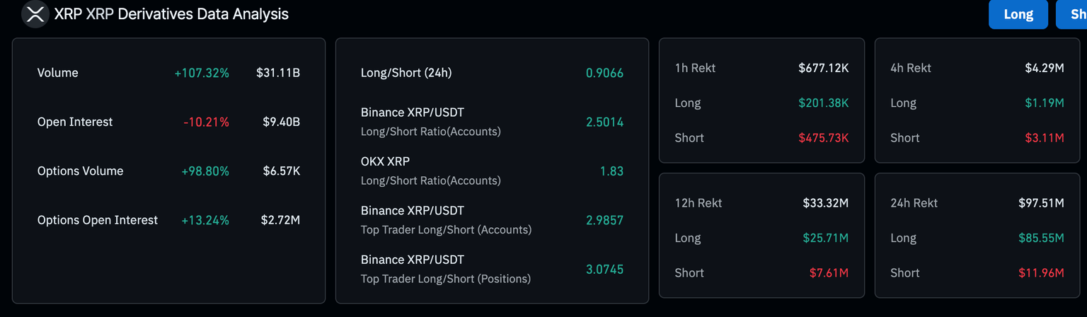 Should the reversal develop into a downward trend, it would indicate a lack of conviction in the ability of XRP to sustain an uptrend. Moreover, the surge in liquidations to $98 million over the last 24 hours, suggests XRP faces an upside heavy trend, likely to lead to a long squeeze and an extended sell-off.