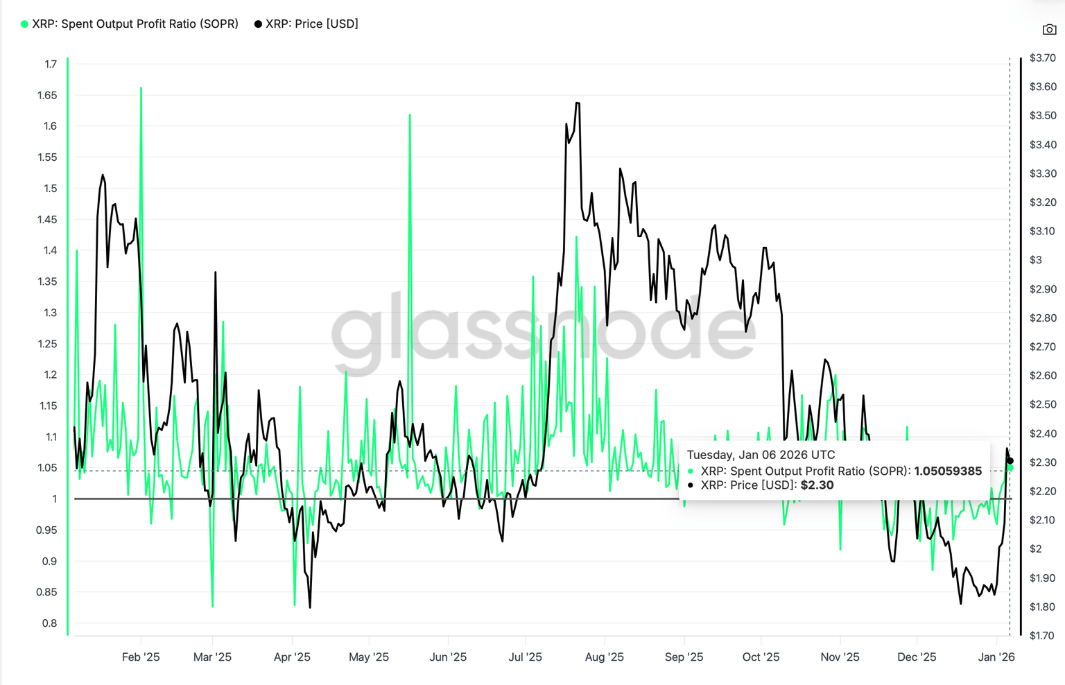 The Spent Output Profit Ratio (SOPR) on-chain metric, computed by dividing realized value (price sold) and the value of XRP at creation (price paid), is resetting. Glassnode data shows the metric at 1.05 as of Tuesday, down from 1.08 the previous day.
