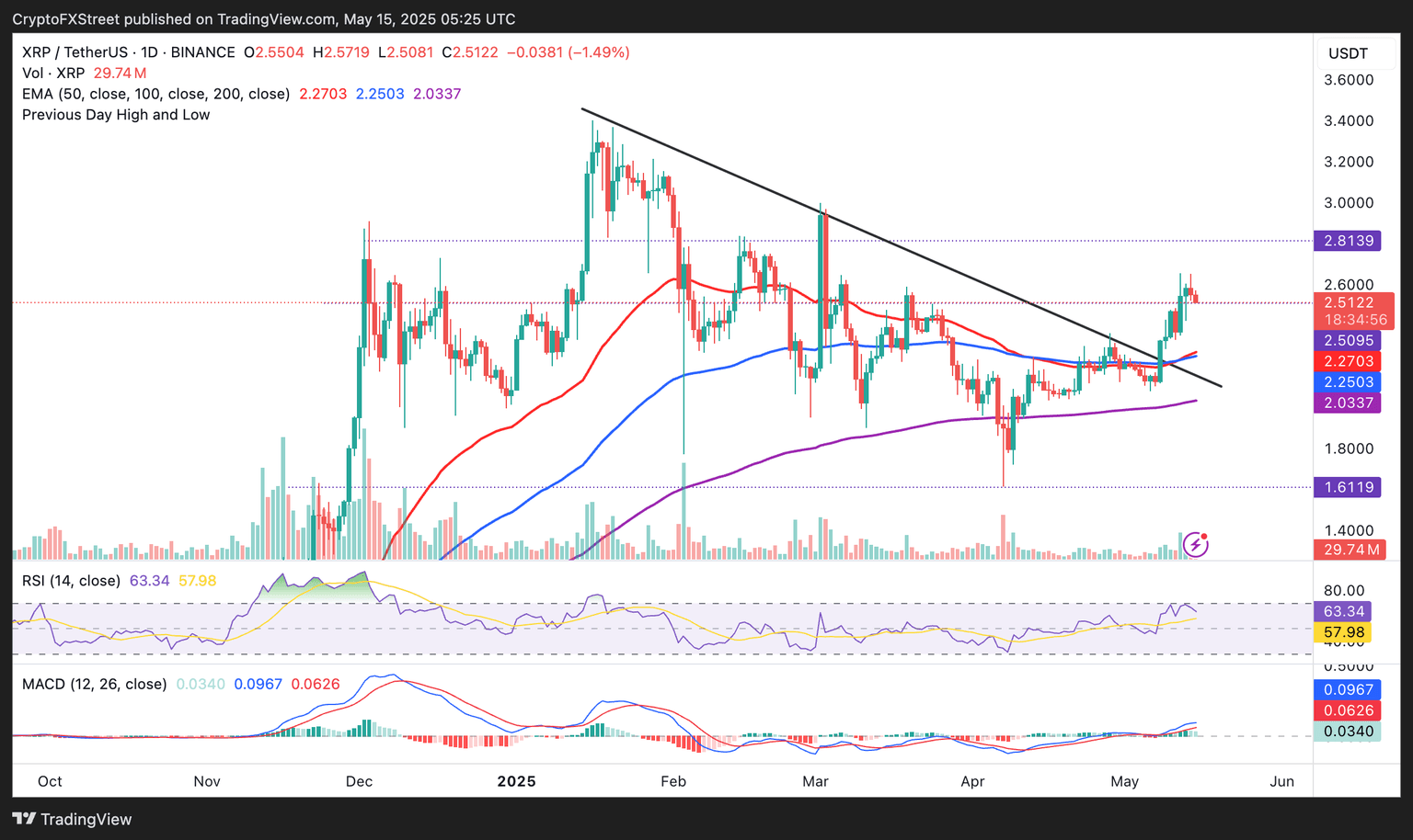 XRP's price sits significantly above key moving averages, including the 50-day, the 100-day and the 200-day Exponential Moving Averages (EMA), signifying a relatively strong tailwind despite the minor pullback from $2.65 reached on Wednesday.