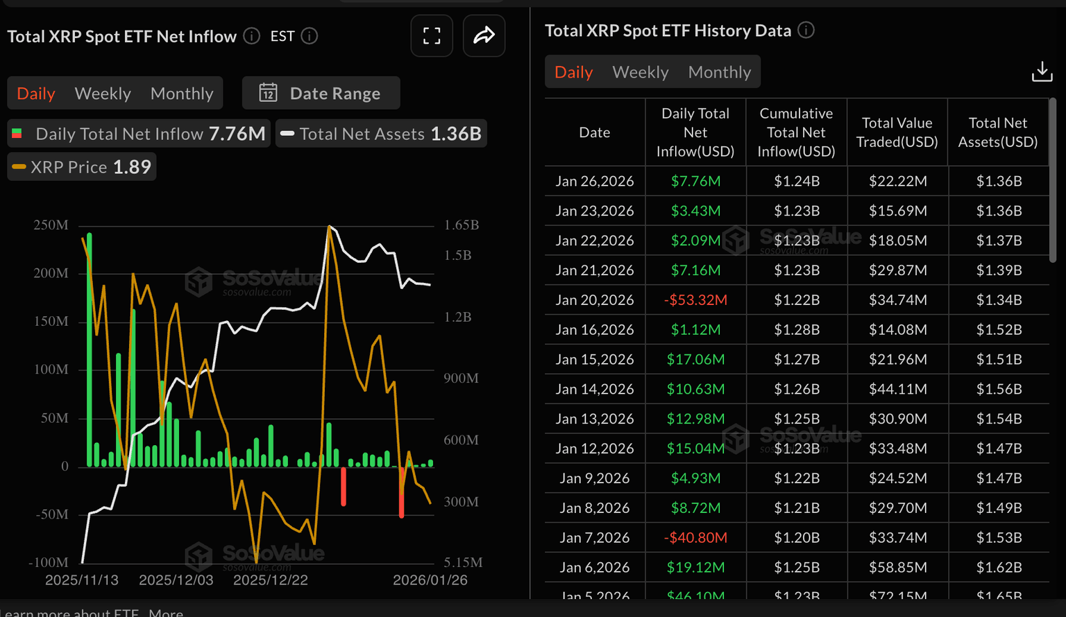 Meanwhile, XRP continues to attract sustained interest from Exchange Traded Funds (ETFs), with a four-day inflow streak. Data by SoSoValue shows that XRP spot ETFs drew nearly $8 million in inflows on Monday.