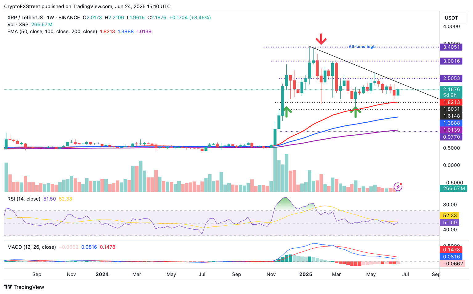 The price of XRP holds significantly above the weekly moving averages, including the 50-week Exponential Moving Average (EMA) at $1.82, the 100-week EMA at $1.38 and the 200-week EMA at $1.01. This technical position cements the bullish structure despite the extended consolidation between April’s support at $1.61 and the May peak of $2.65.