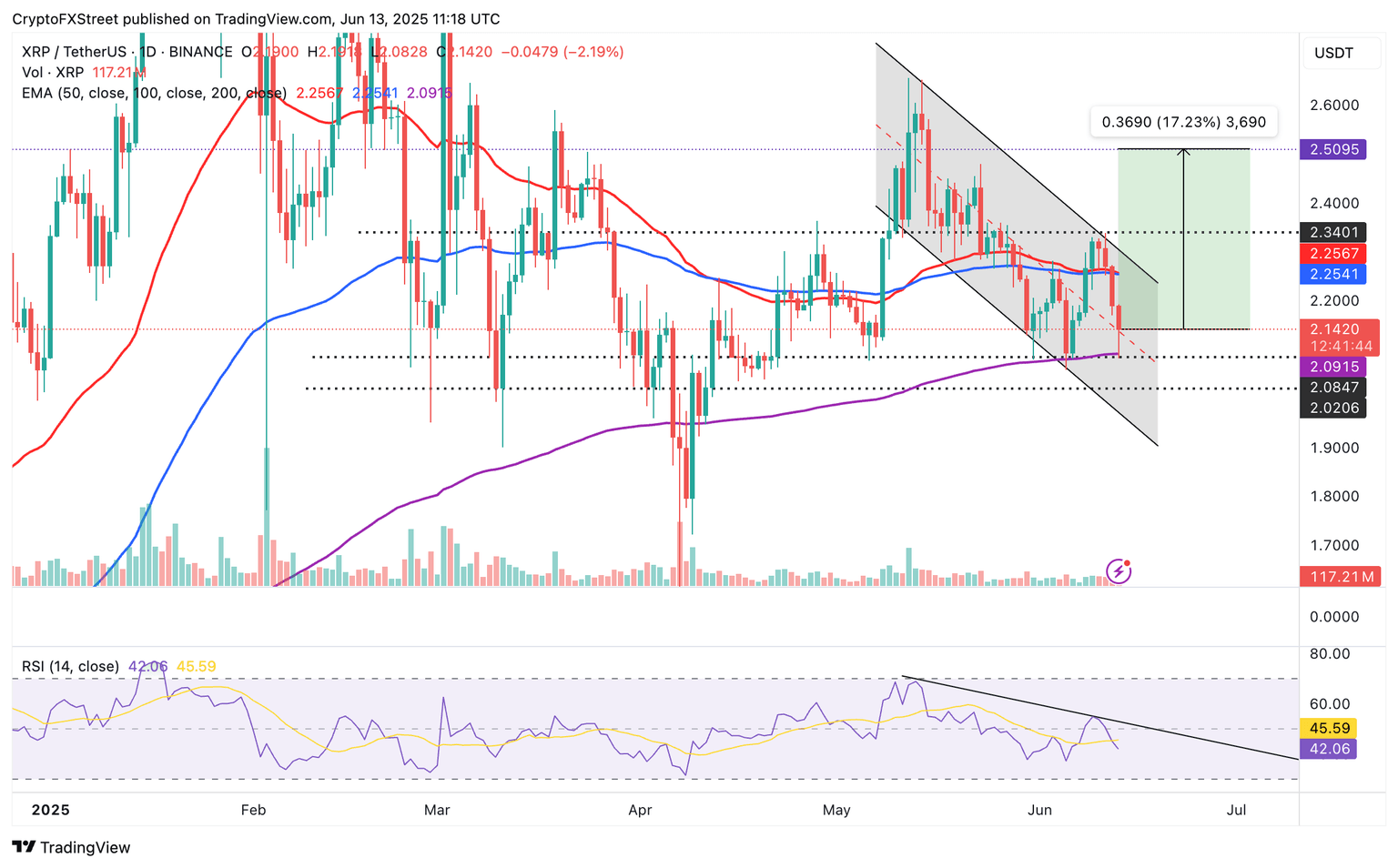 XRP’s price hovers at around $2.14 at the time of writing after a slight recovery from support at around $2.09, reinforced by the 200-day Exponential Moving Average (EMA).