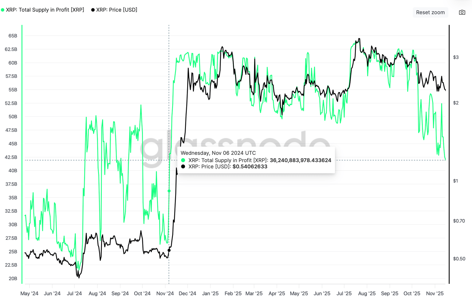- Supply in profit drops to 42 billion XRP, matching levels last seen in November 2024.
