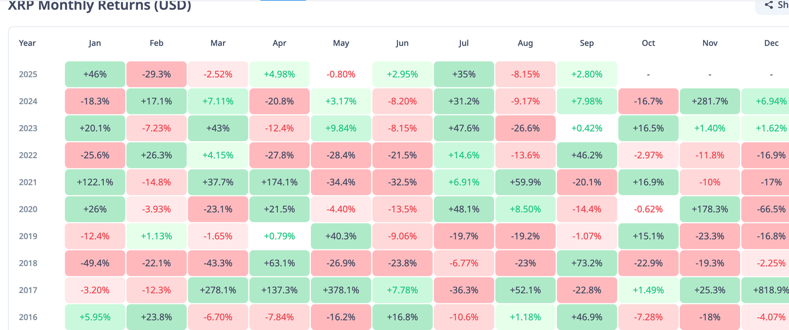 However, based on CryptoRank's data, XRP is on course to end September with marginal profits of about 2.76%. The table below shows that XRP has posted profits in three consecutive Septembers, with the highest gains of 46% in 2022.