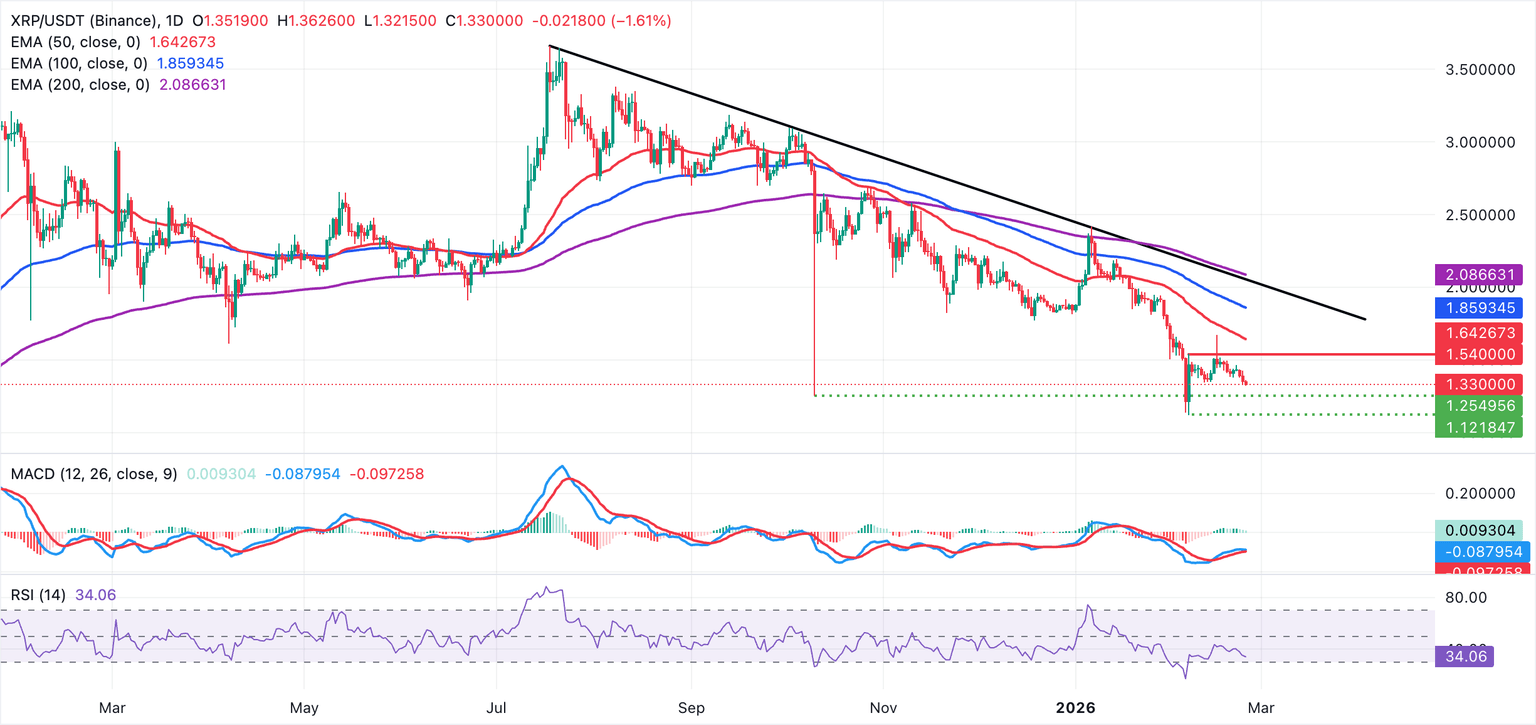 XRP hovers at $1.33 on the daily chart, held down by a prevailing bearish bias. The remittance sits well below the 50-day Exponential Moving Average (EMA), 100- and 200-day EMAs, clustered between $1.64 and $2.08, underscoring a dominant downward trend.
