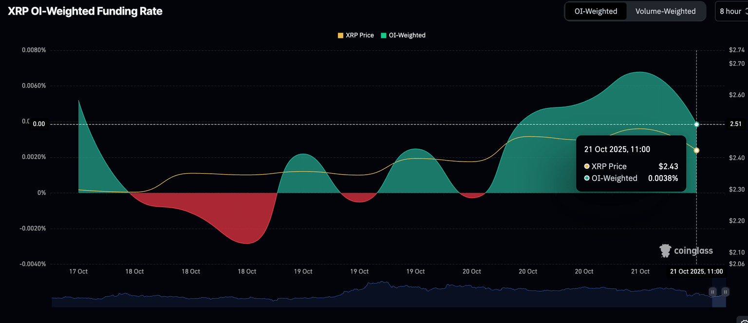 A sharp drawdown in the OI weighted funding rate to 0.0038% from 0.0068% on Monday suggests that traders are increasingly piling into short positions, citing negative sentiment surrounding XRP.