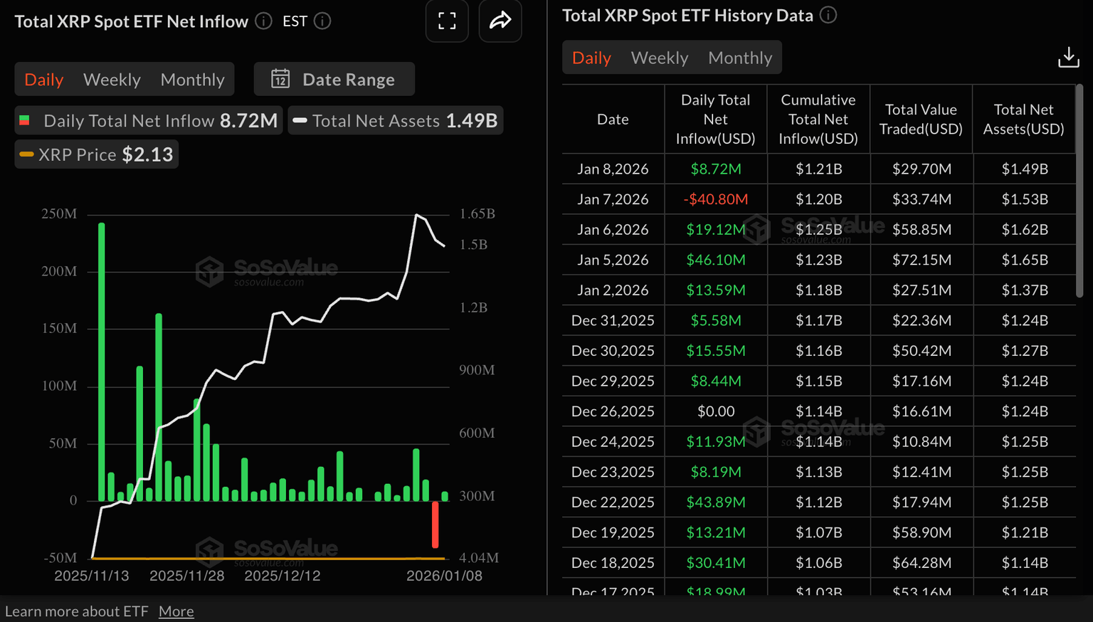 As retail demand gradually dwindles, institutional interest is back on track, as reflected by the XRP spot ETFs recording nearly $9 million in inflows on Thursday. SoSoValue data shows that the ETFs broke their record of steady inflows on Wednesday, with outflows totaling $41 million that day. The resurgence of inflows could be a signal that institutional interest in US-listed ETFs will continue.