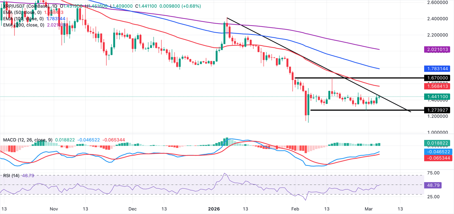 XRP hovers above $1.44 as its short-term outlook turns mildly bullish, supported by a gradually increasing Relative Strength Index (RSI) at 49 on the daily chart. The Moving Average Convergence Divergence (MACD) indicator remains above its signal line on the same chart, with green histogram bars expanding. If this short-term bullish case holds, XRP could drift higher toward the 50-day Exponential Moving Average (EMA) at $1.57.