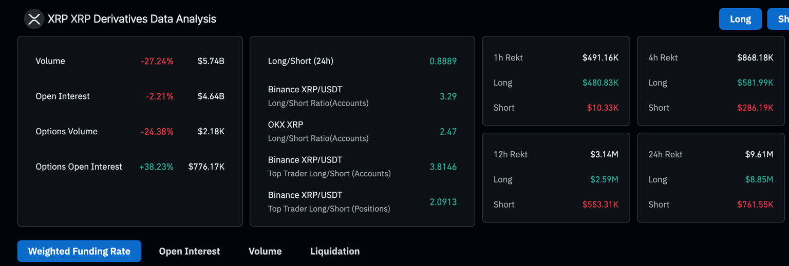 Derivatives data from CoinGlass reveals a 2.21% drop in OI to $6.64 billion and a 27.24% decline in the trading volume to $5.74 billion. OI represents the total number of outstanding derivative contracts that haven't been settled, like futures or options.