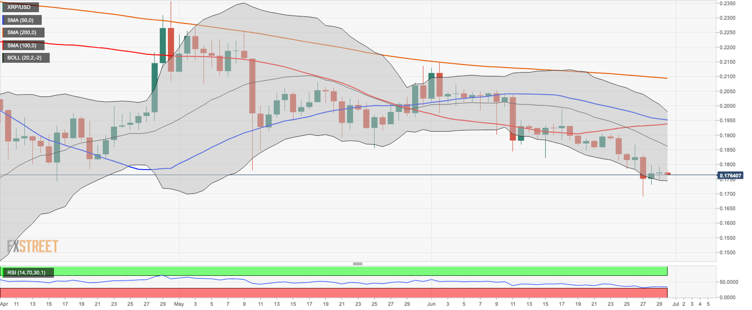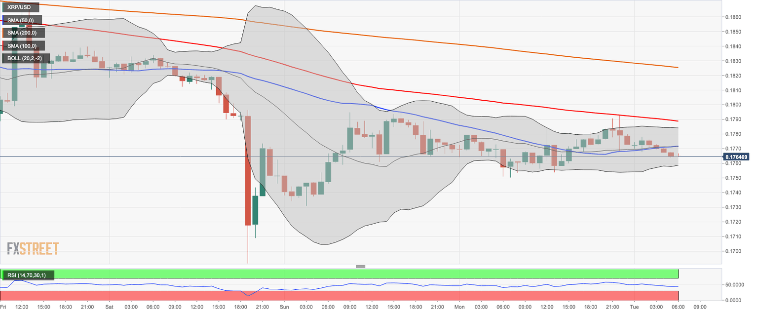 XRP/USD has settled in the middle of $0.1700-$0.1800 range after a sharp sell-off to $0.1691 during the past weekend. At the time of writing, the coin is changing hands at $0.1766, mostly unchanged both on a day-to-day basis and since the beginning of Tuesday. Ripple's XRP is the fourth-largest digital asset with the current market value of $7.8 billion and an average daily trading volume of $1.14 billion. The coin is still down nearly 7% on a weekly basis.