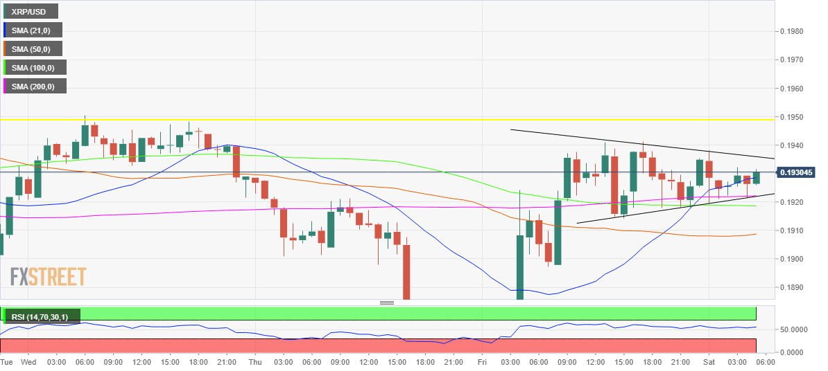 Having recovered sharply from weekly lows of 0.1846 on Friday, Ripple (XRP/USD) consolidates the relief rally in Saturday’s quiet trading so far, tracking the broad sentiment across the crypto space. The third-most traded cryptocurrency stalled its recovery momentum, as the bulls continued to run into stiff resistance near 0.1950 region. Despite the subdued trading activity, the coin enjoys a market capitalization of about $ 8.35 billion, up nearly 2% over the last 24 hours.