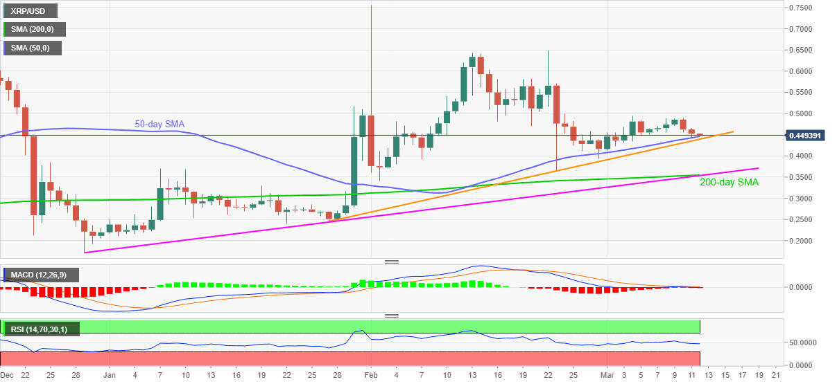 In a case where XRP/USD drops below the $0.4400 support line, lows marked during February around $0.3930 and $0.3650 can entertain the sellers ahead of challenging them with a confluence of 200-day SMA and an ascending trend line from December 29, 2020.