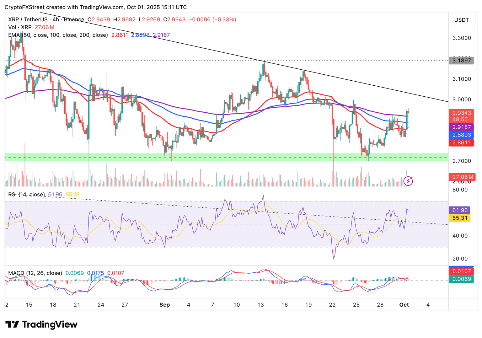 Ripple (XRP) upholds an intraday bullish outlook, trading above $2.93 on Wednesday. The crypto market has generally kicked off October on a positive note, providing insight into the direction trading may take in the coming weeks.
