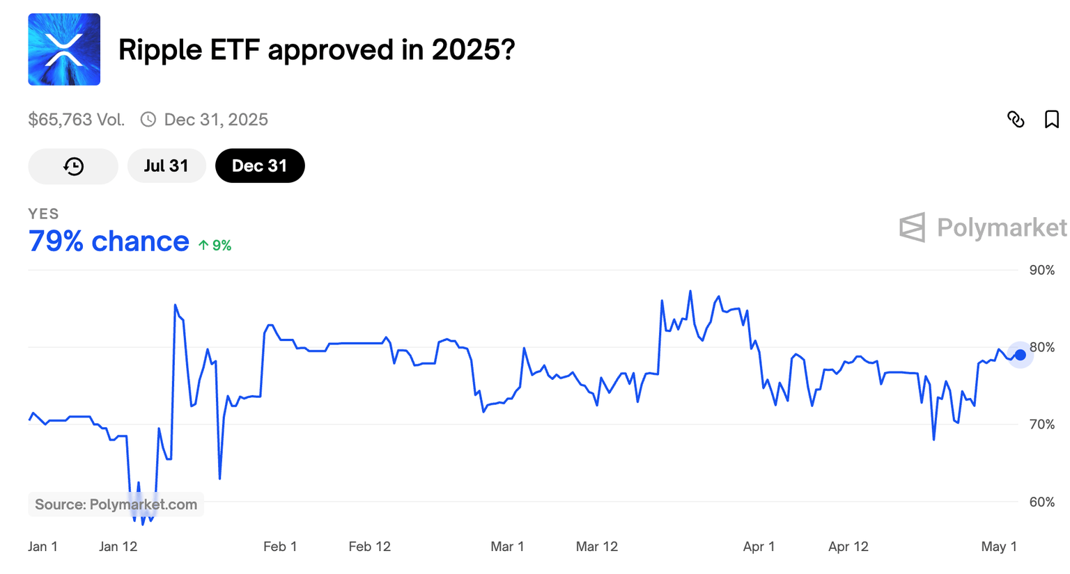 The change of leadership at the SEC, with Paul Atkins as the Chair of the regulatory agency, has seen the chances of an XRP spot ETF approval jump to 85% from 65% in just two months. According to Santiment, “traders are now predicting new all-time highs for XRP, and betting platforms like Polymarket reflect this shift, with 79% odds of approval by the end of the year.”