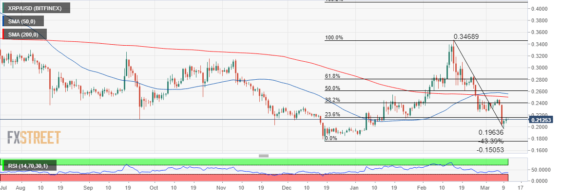 The daily chart for XRP/USD shows the price trading above $0.2100 following a recovery from the recent dip to $0.1982. Unfortunately, the immediate upside is capped by the 23.6% Fibonacci retracement level of the last drop from $0.3470 to a low around $0.1751. The selling pressure at this level has intimidated the buyers who still have eyes on the hurdle at $0.2200.