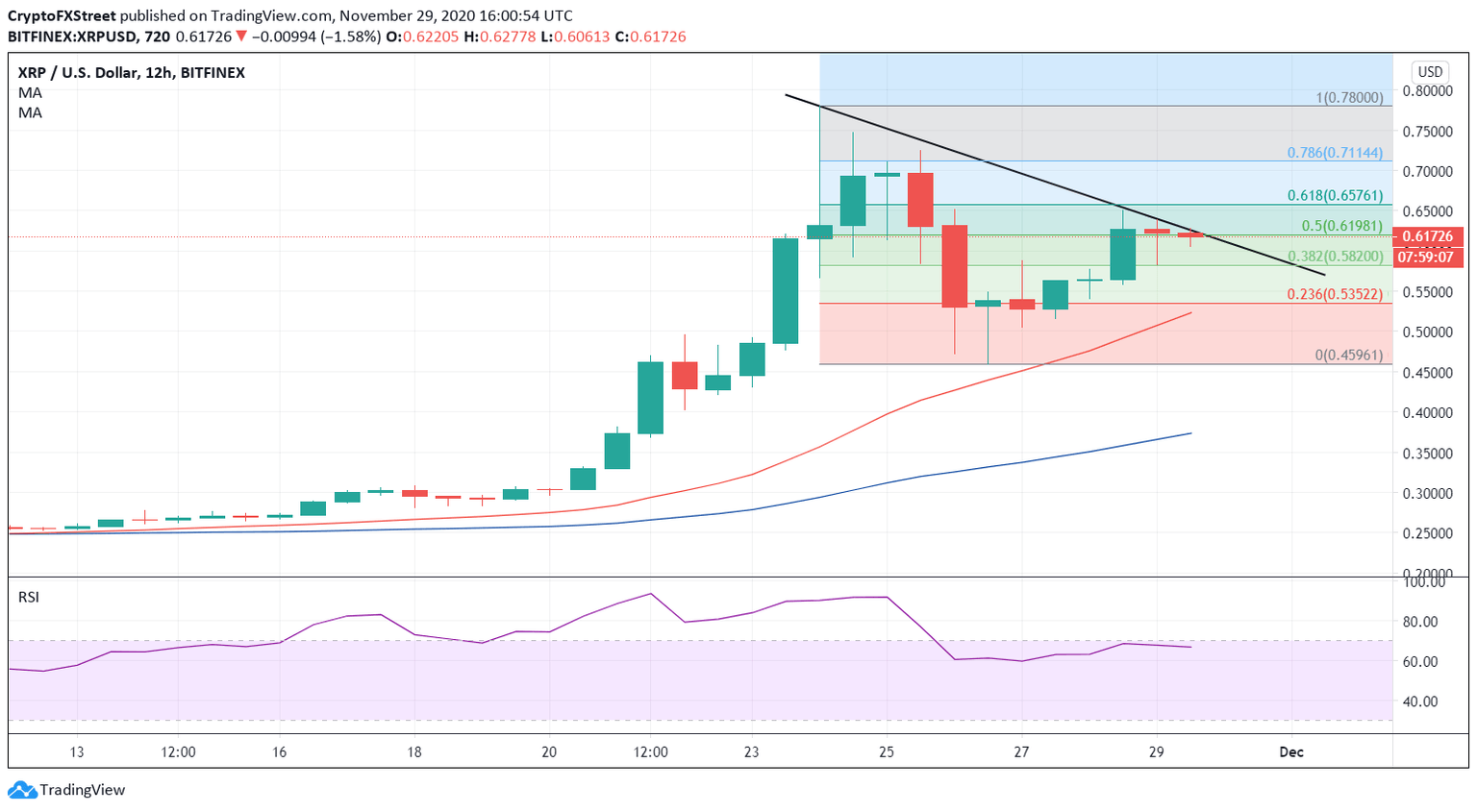 Looking at the 12-hour chart, Ripple continues to face strong offers at the one-week-old descending trendline resistance, now at $0.6262.