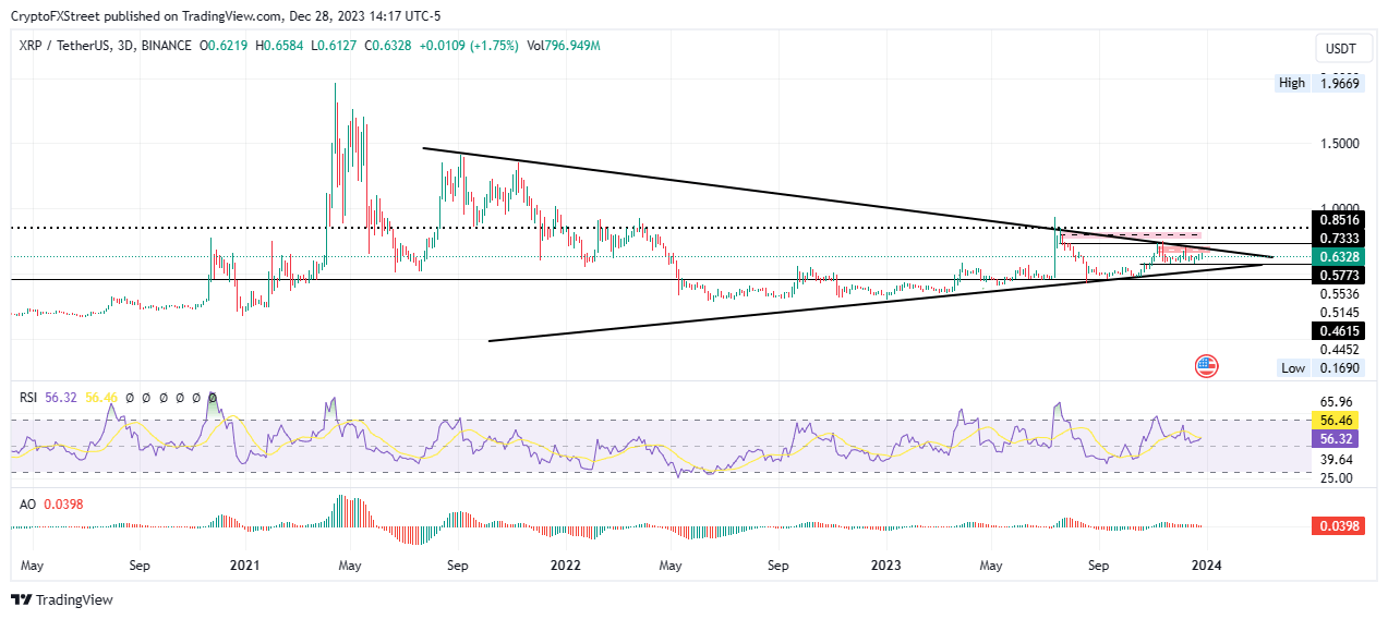 On the daily timeframe, Ripple price is testing the upper boundary of the symmetric triangle, with the position of the Relative Strength Index (RSI) above the 50 level, coupled with the presence of green histogram bars of the Awesome Oscillator (AO) suggesting that the upside potential remains alive.