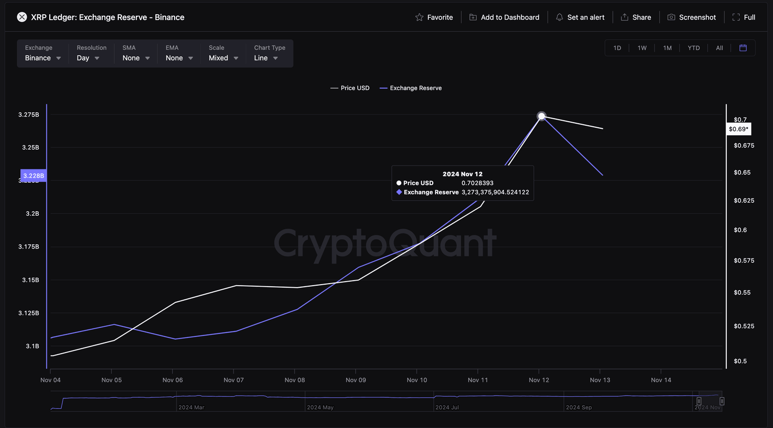 The chart above shows the Exchange reserves stood at 3.27 billion XRP at close of November 12.